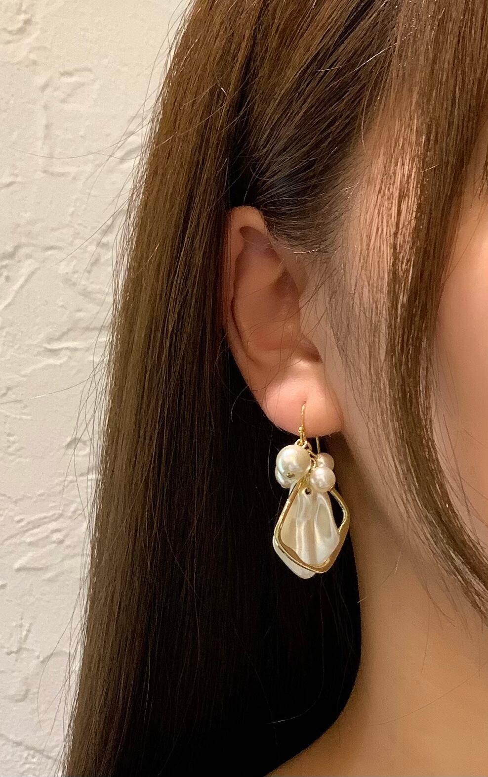 パールの下に花びらと金属パーツをぶらさげたフックピアスです。