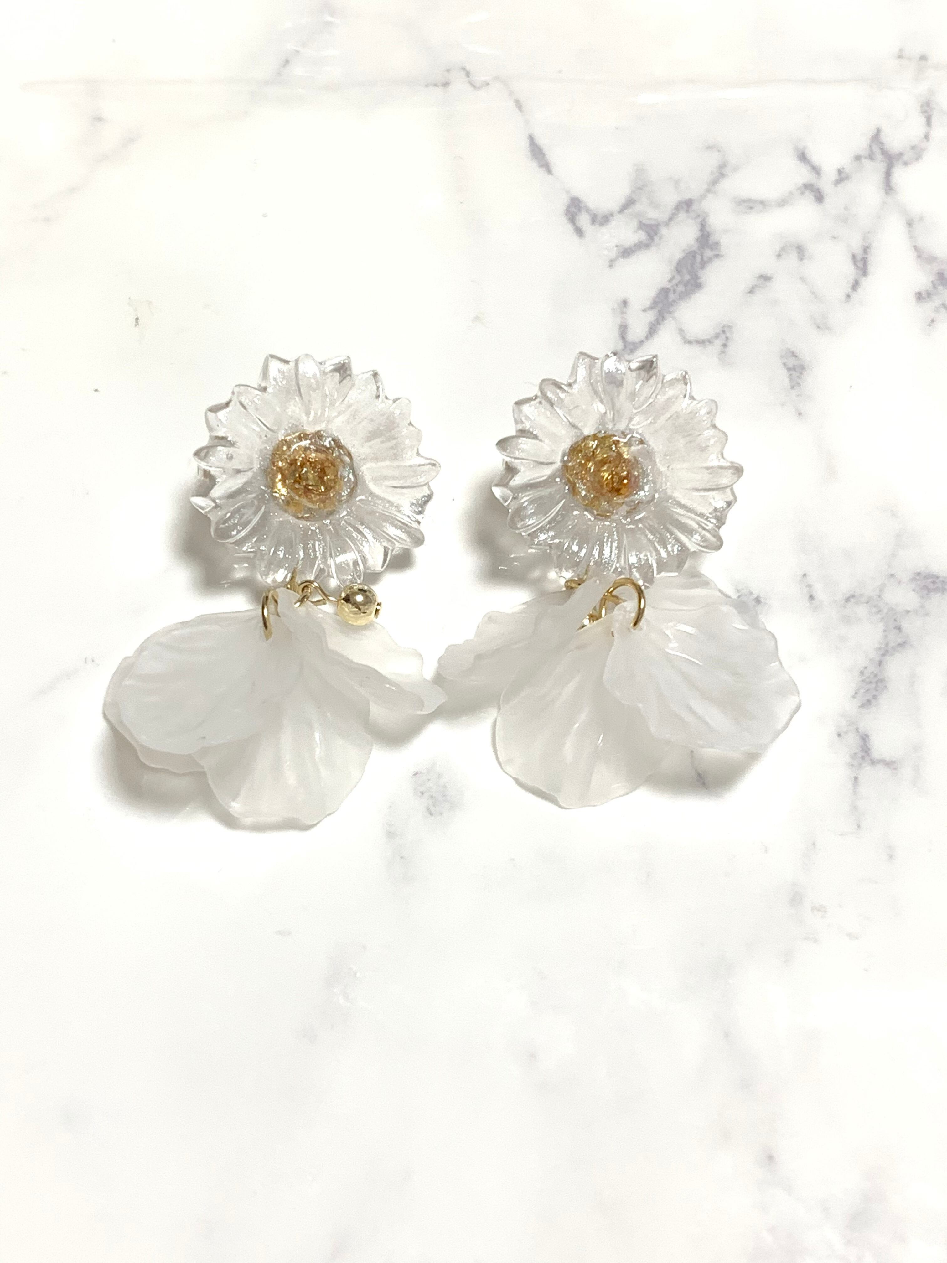 レジンのクリアフラワーに花びらをたくさんつけたピアスです。