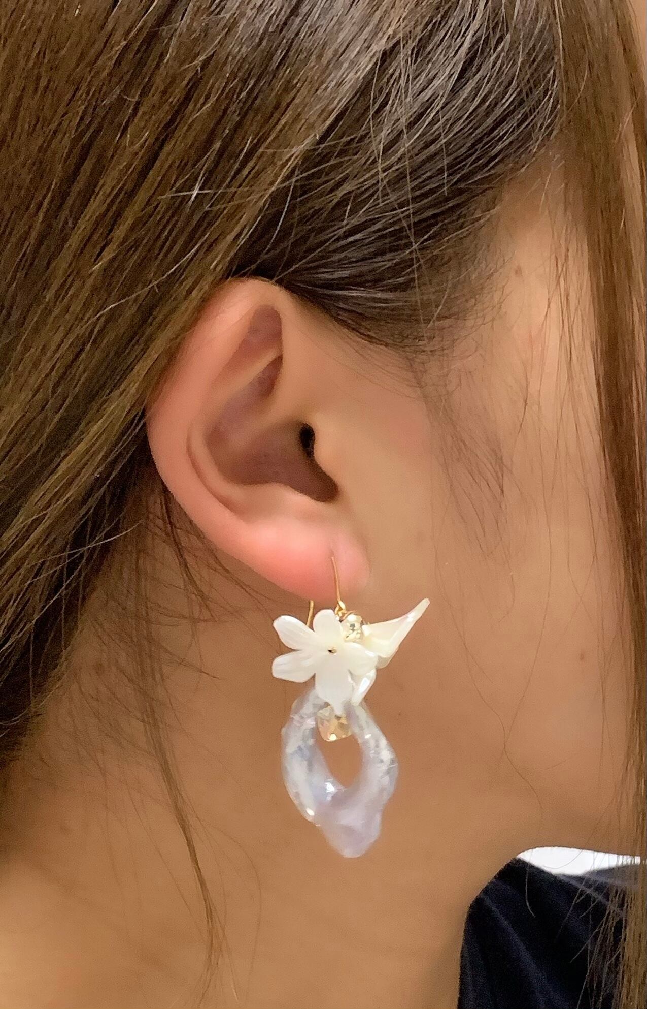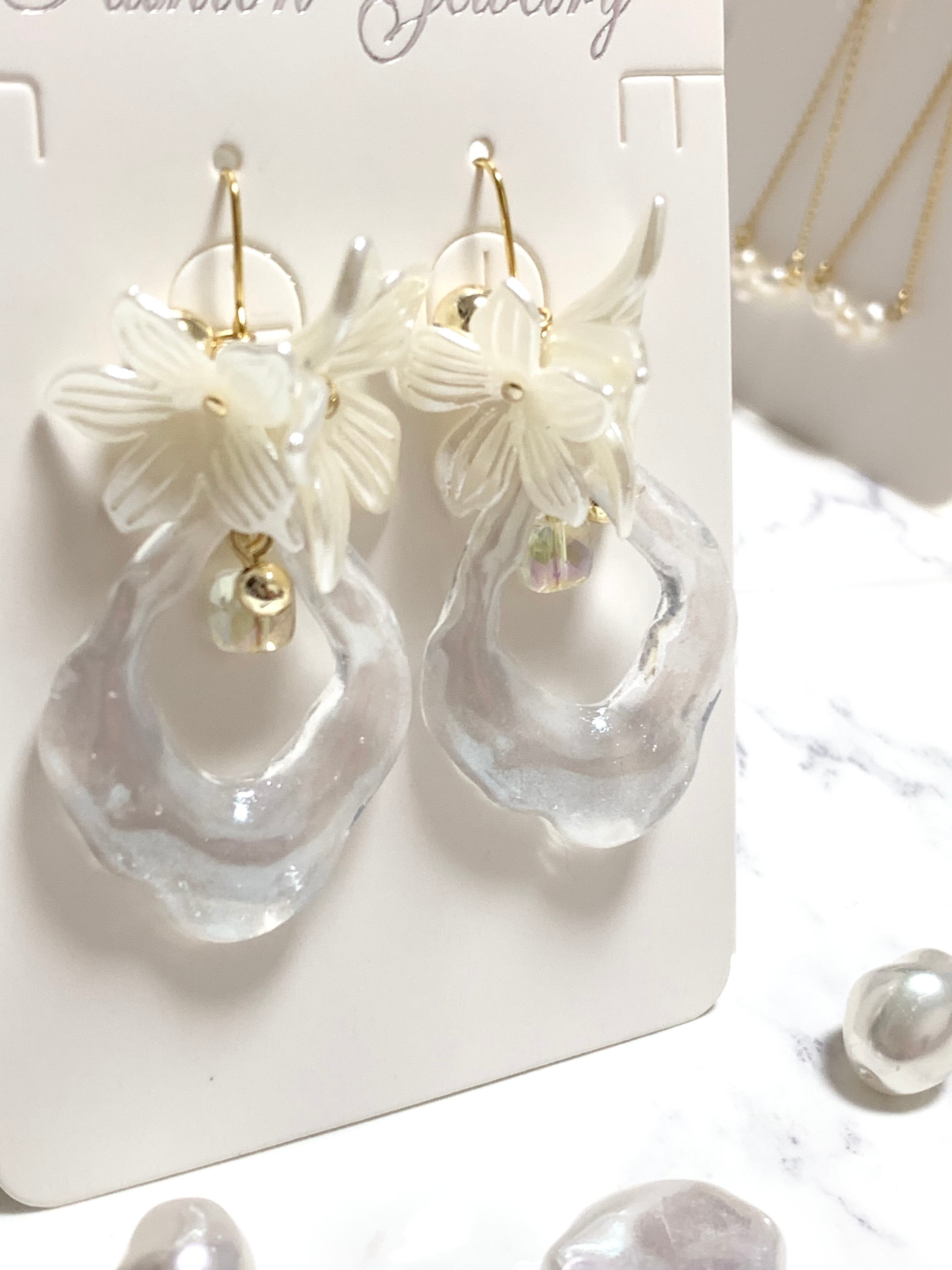 パール調のフラワーと金ビーズ、にクリアレジンのパーツをぶら下げたフックピアスです。