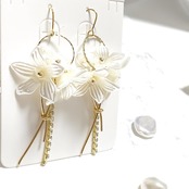 メタルフープにパール調のフラワーとリボンチャーム、ラインストーンチェーンをぶら下げたピアスです。