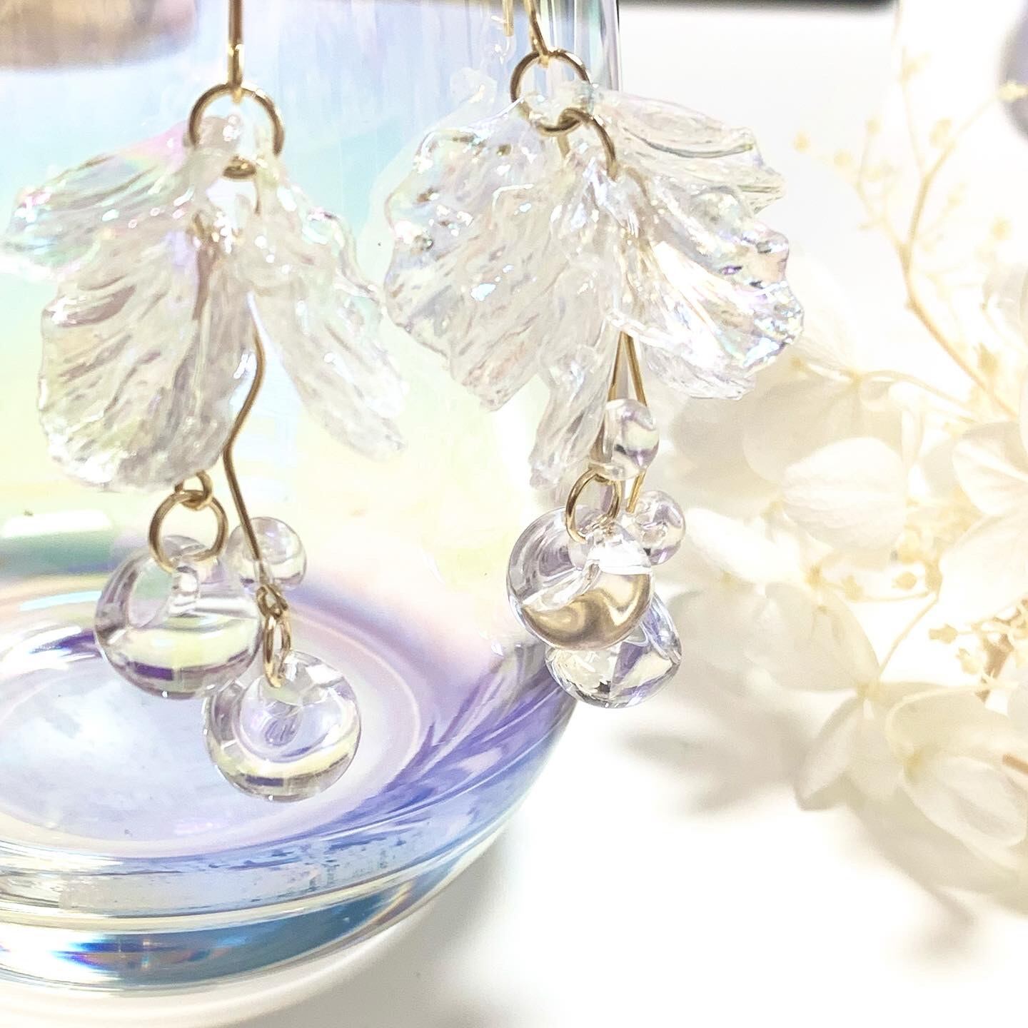 オーロラカラーのフラワーに丸いすず丸ビーズをぶら下げた透明感のあるピアスです。