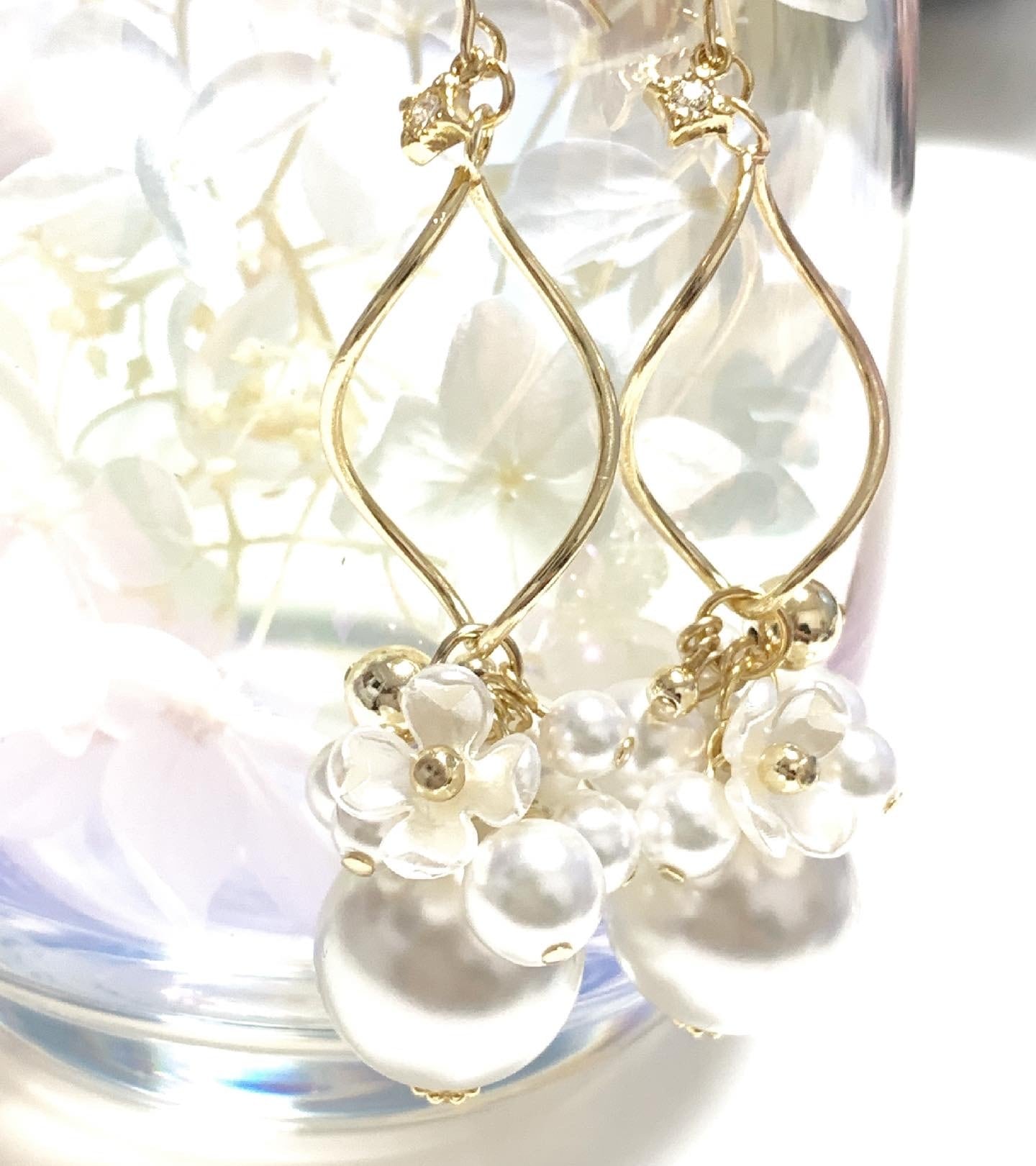 流れる様なツイストのメタルパーツにぶら下がった大粒パール、小粒パール、パール調フラワーは、ツイストパーツの揺れと一緒にくるくると揺れ、上品さの中に可愛らしさを演出してくれます♡