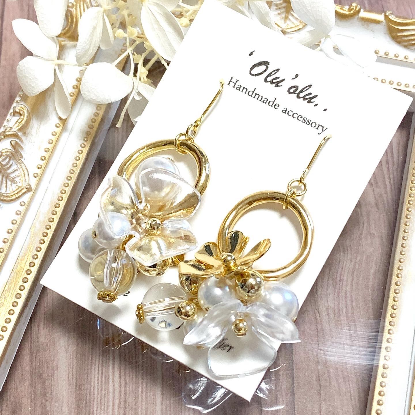 メタルリングに2種類のフラワー、ゴールドビーズ、パール、クリアビーズをつけたピアスです。