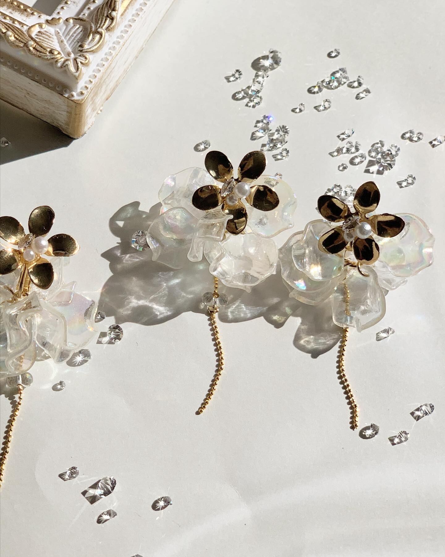 ゴールドフラワーの下に沢山のオーロラフラワーとチェーンをぶら下げたピアスです。